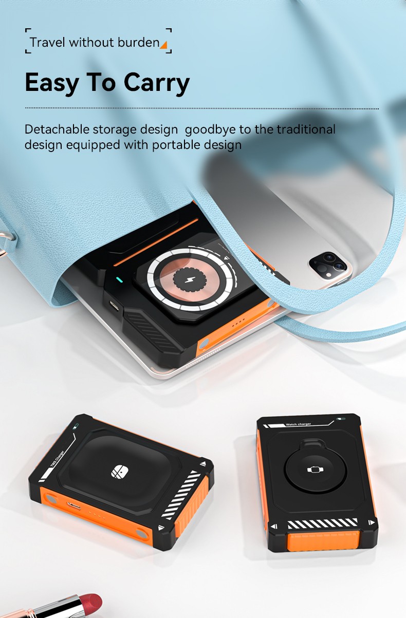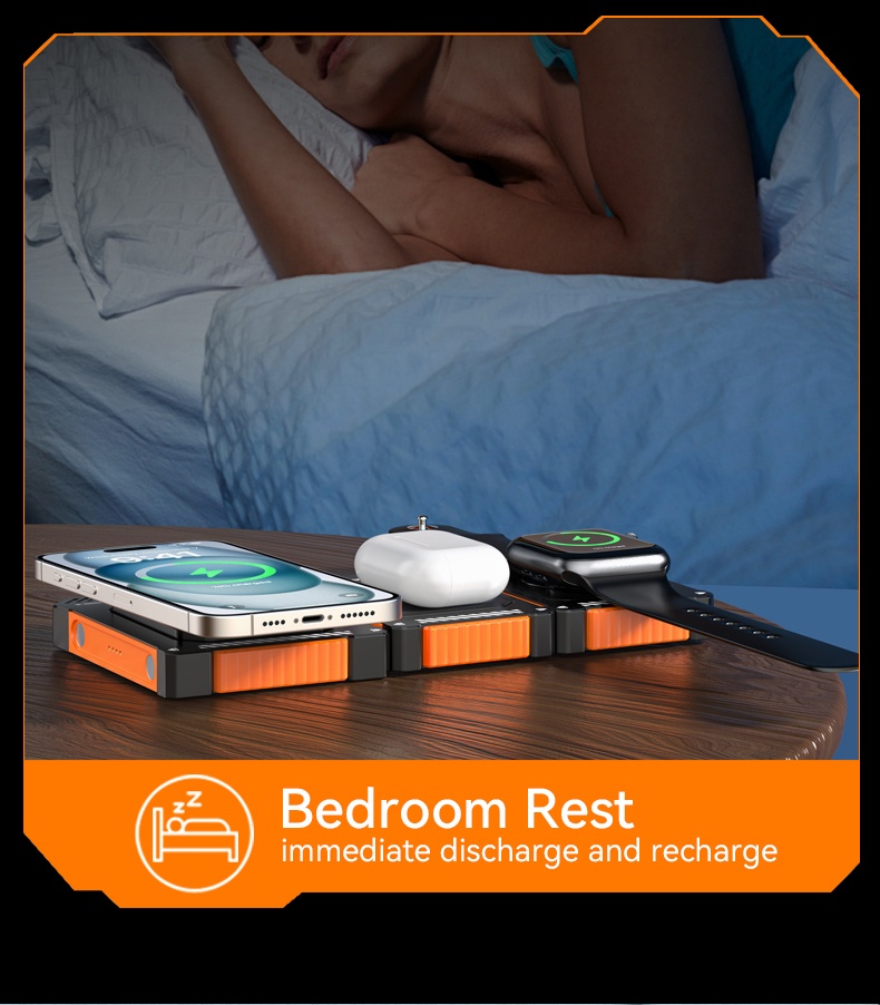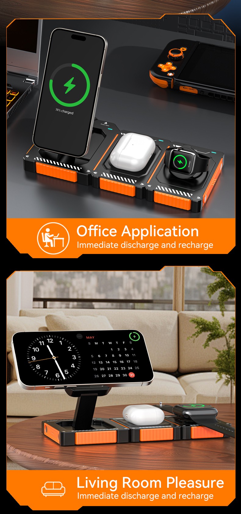 The three-in-one magnetic wireless charger can charge three devices simultaneously: mobile phone, watch and headphones, making your desktop neater and more convenient
