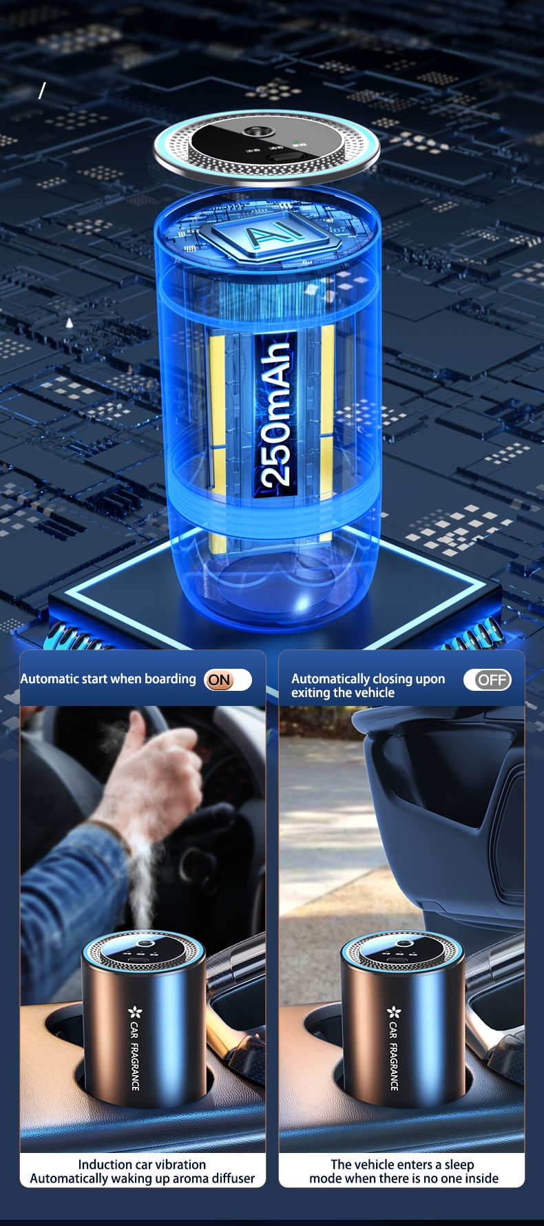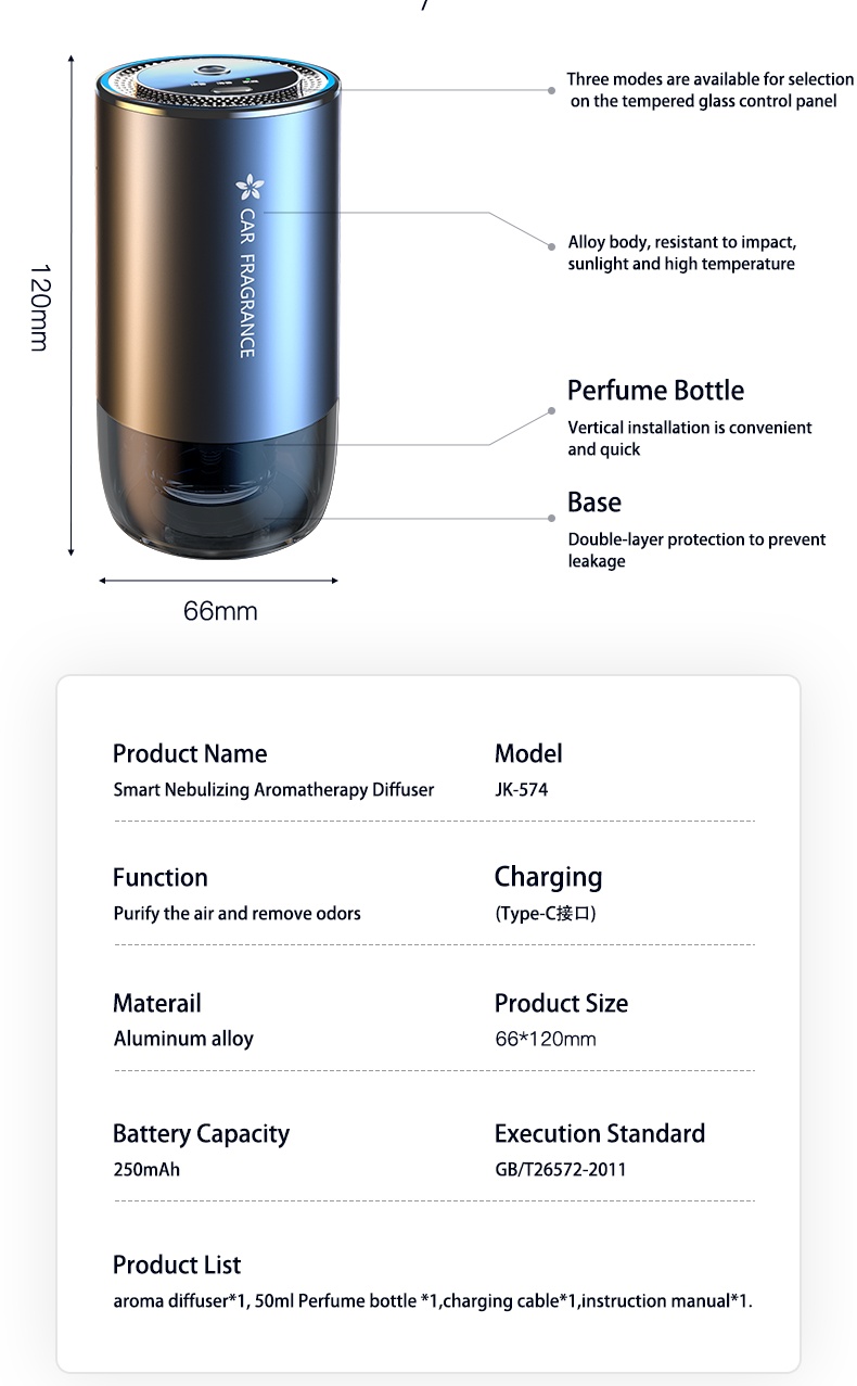 This smart car perfume diffuser boasts a sleek and fashionable design, with an eye-catching black color that's currently popular among consumers.The long-lasting scent ensures a continuous supply of fresh air for both home and car interiors, creating a comfortable and relaxing environment. It is USB-powered and requires no additional installation, making it easy to use and energy-efficient.Crafted from high-quality aluminum alloy, this diffuser is durable and built to last, adding a touch of elegance to any setting.The electric drive work mode ensures silent operation, making it ideal for both home and car use without disturbing daily routines or conversations,At only 66mm x 120mm, this compact car perfume diffuser is convenient to carry and portable, making it perfect for use in different spaces and settings whether at home or on the go. As a new arrival product, it stands out among other air fresheners in the market and is the perfect choice for those seeking a smart, stylish, and effective solution for maintaining a fresh and pleasant environment.