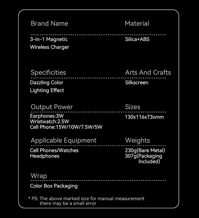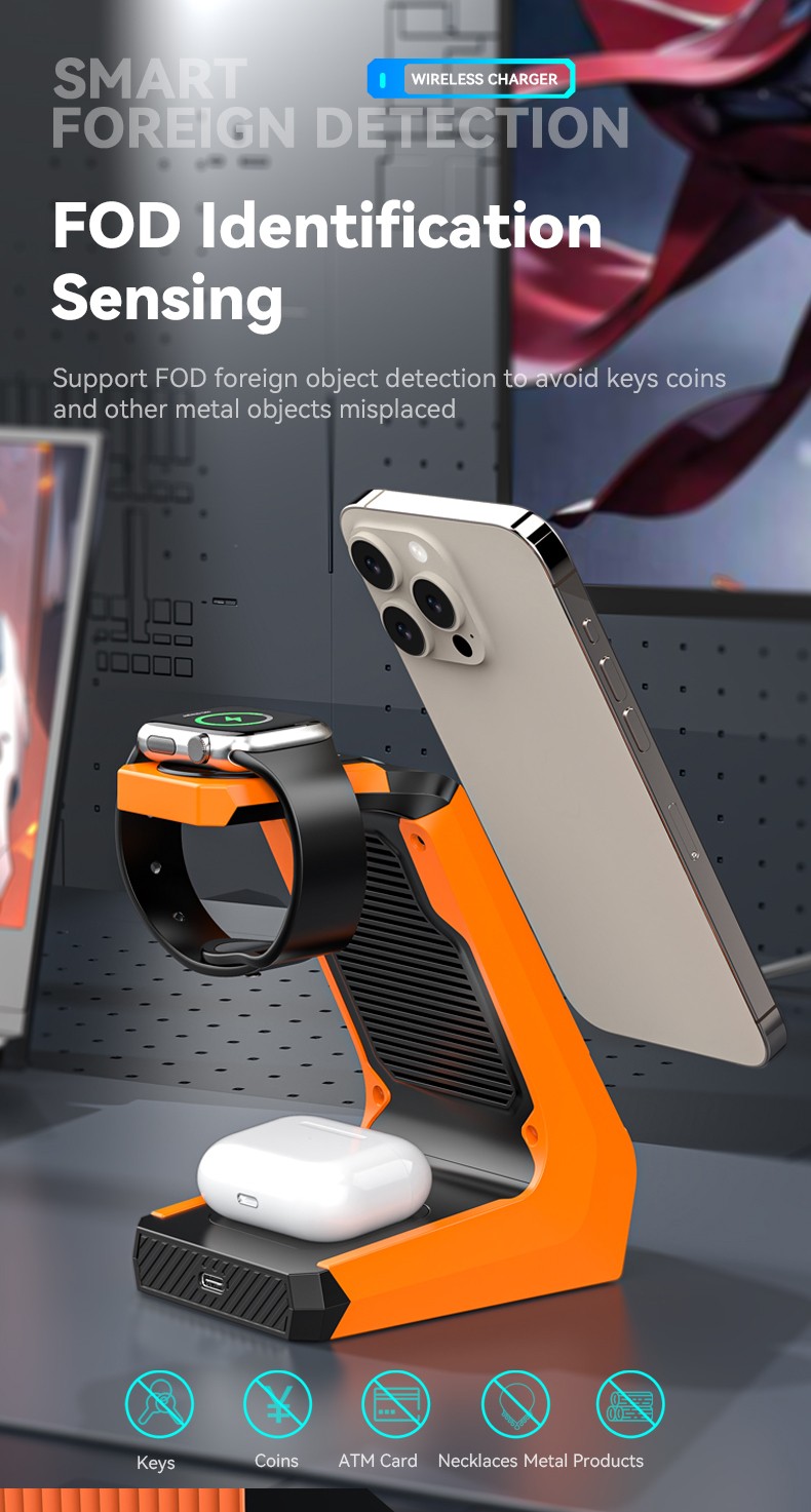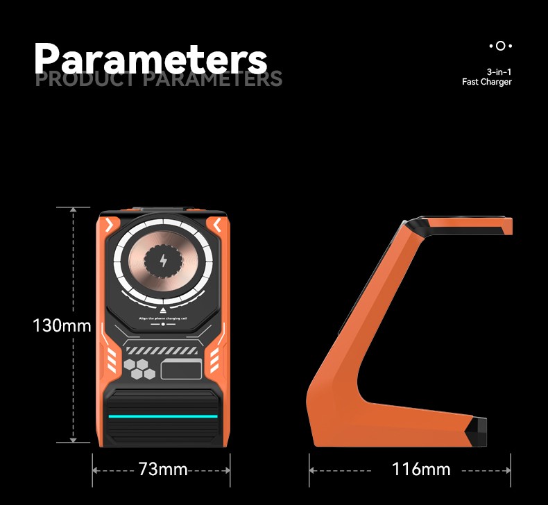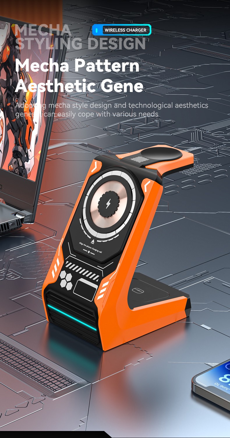 | Function | 15W Magnetic Wireless Charging Station With mecha-style for Phone SmartWatch and Earbudsr |