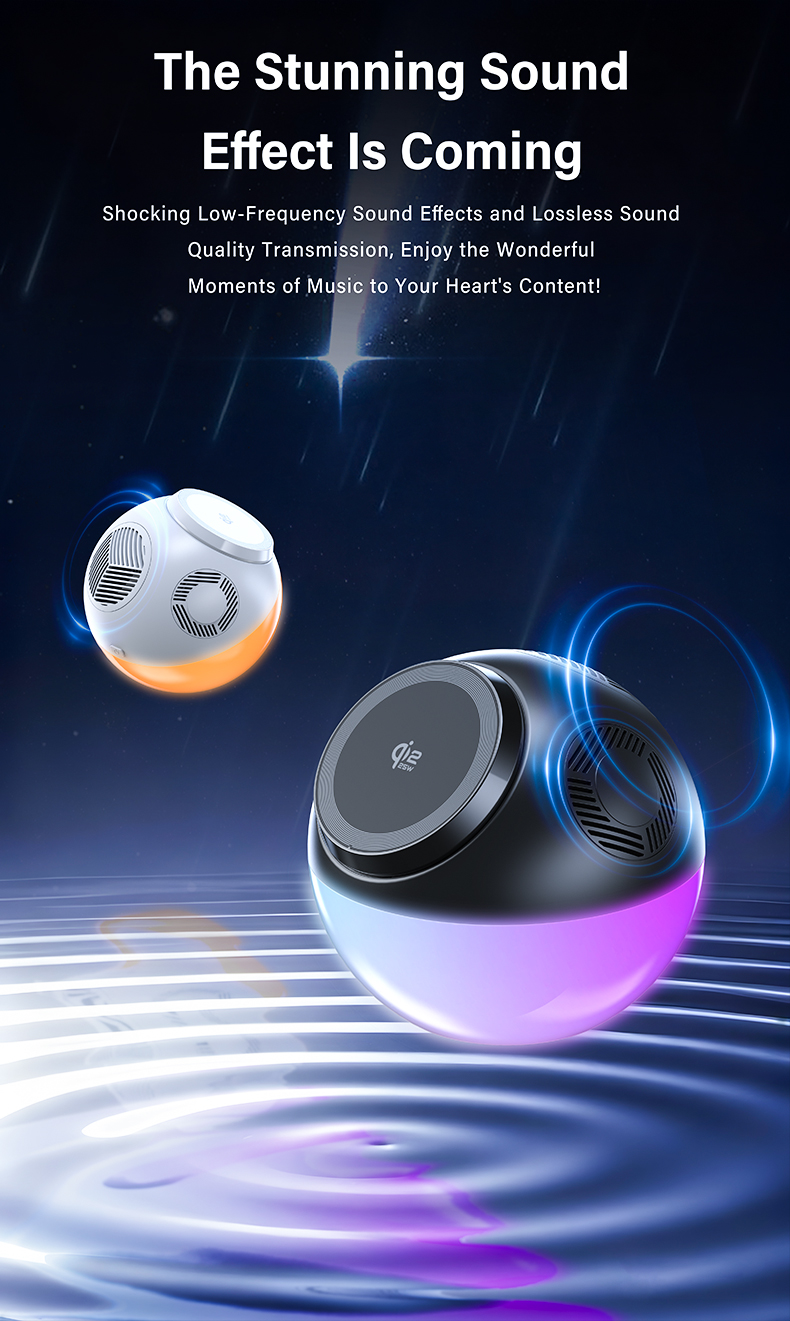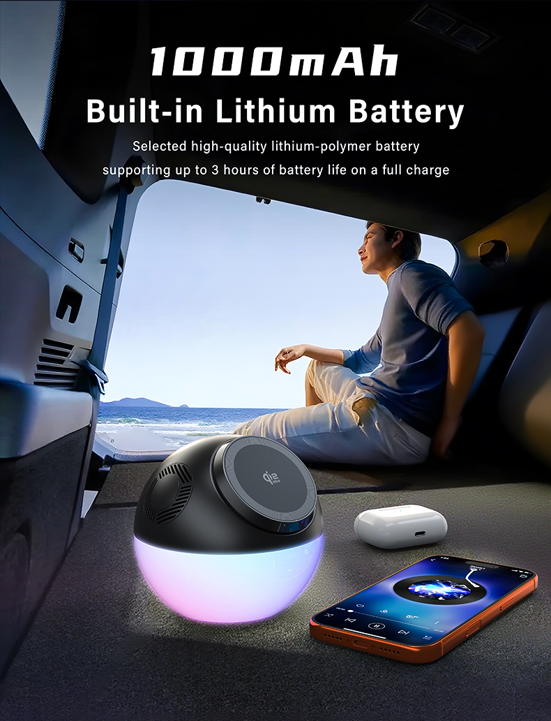 ND-T2 wireless fast charging with bluetooth speaker with GRB ambiance lights is equipped and a built-in 1000mAh lithium battery
