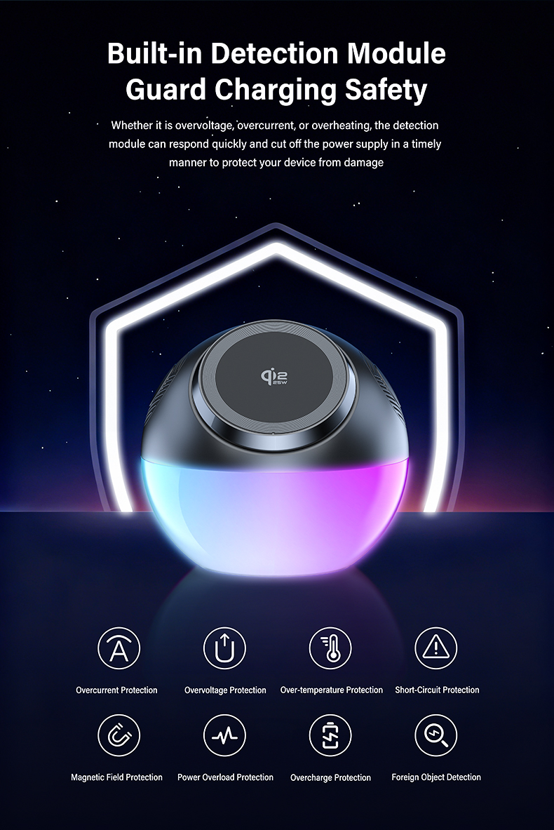 ND-T2 is an all-in -one device integrating MPP 25W magnetic wireless fast charging,a Bluetooth speaker,and an GRB ambient light,with a built-in lithium battery,the Bluetooth speaker delivers powerful sound quality and supports lossless sound transmission,the RGB ambient light comes with 5 freely adjustable light modes,powered by a built-in 1000mAh lithium battery,it offers 3 hours of battery life on a full charge,it features no overheating during charging and supports safe charging and discharging,what’s more,it is compatible with iOS 17 StandBy landscape mode-simply place it down and it will display the time,date and weather instantly,it is equipped with a built-in detection module,providing multiple protection functions including overcurrent,overvoltage,overtemperature,short-circuit,magnetic field,power,overcharge and foreign object detection.