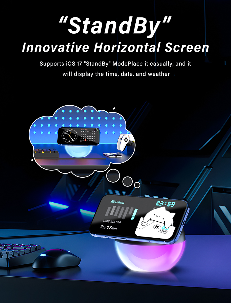 Supports iOS 17”StandBy”Modeplace it casually,and it will display the time,date and weather.