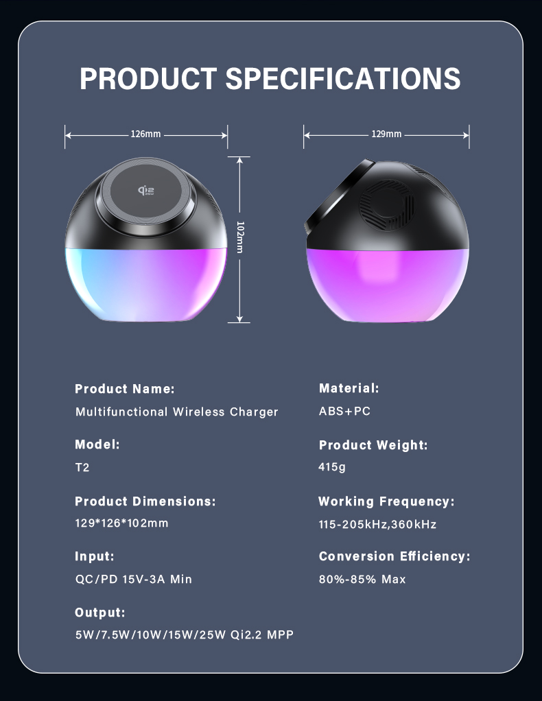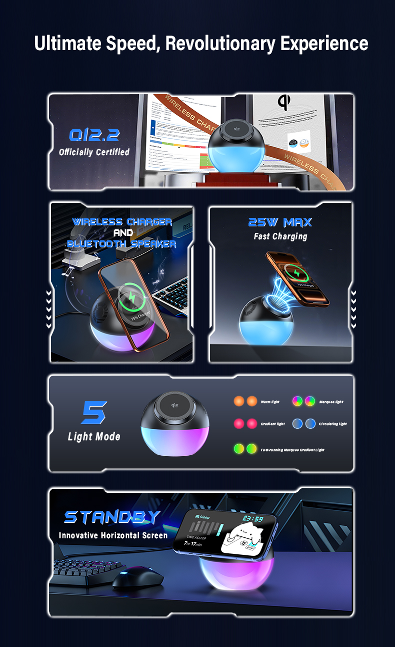 | Product name | MPP 25W fast wireless charger with bluetooth speaker with GRB ambiance lights is equipped |