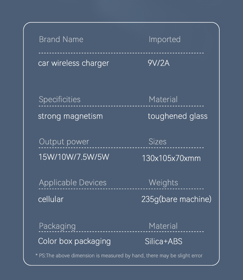 | Function | 15W magsafe car wireless charger touch sensitive transparent car wireless charging |