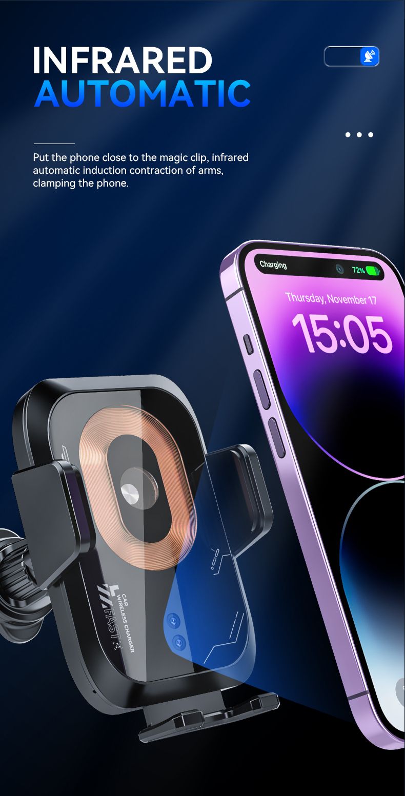 | Product name | 15W Car wireless charger infrared induction car mobile phone bracket three axis linkage transparent car outlet wireless charger |