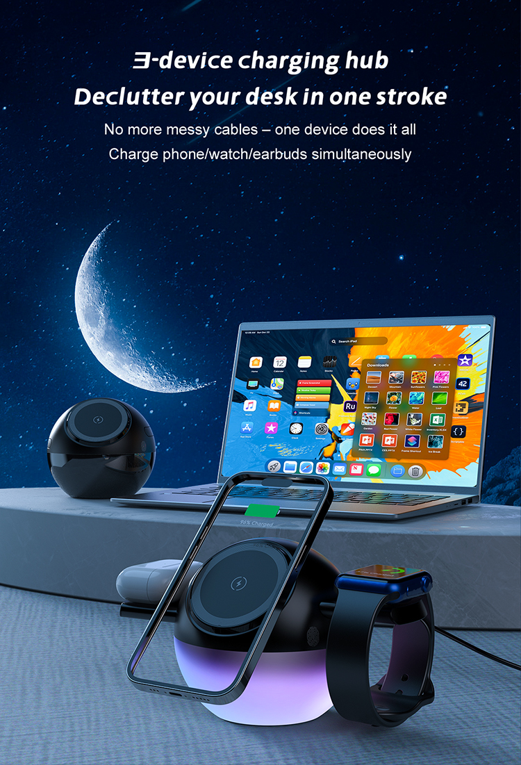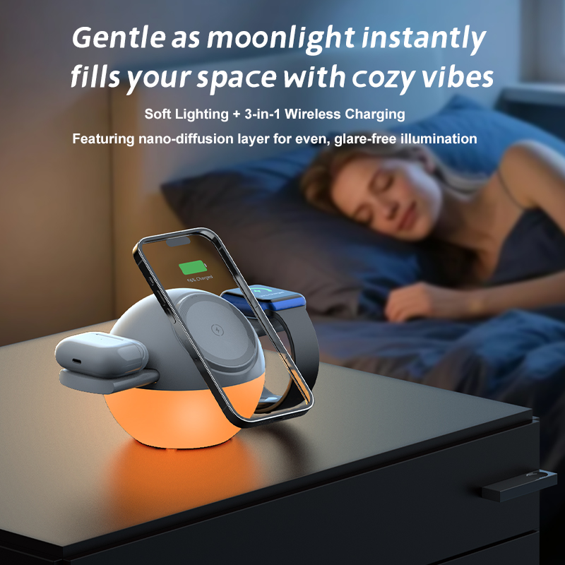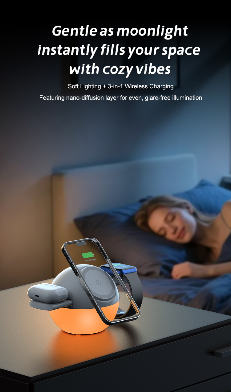 Soft Lighting+3-in-1 wireless charging Featuring nano-diffusion layer for even,glare-free illumination.