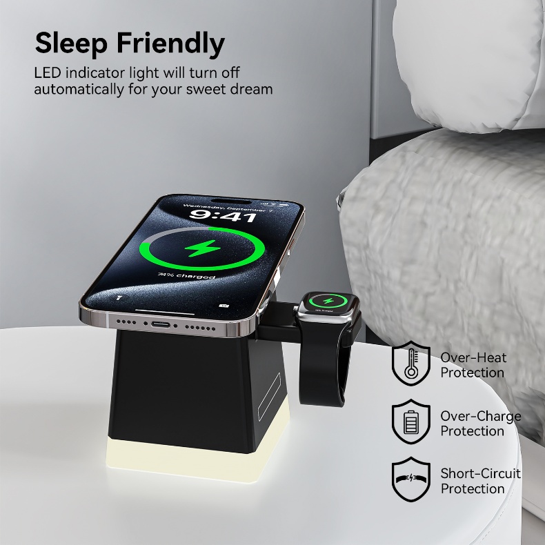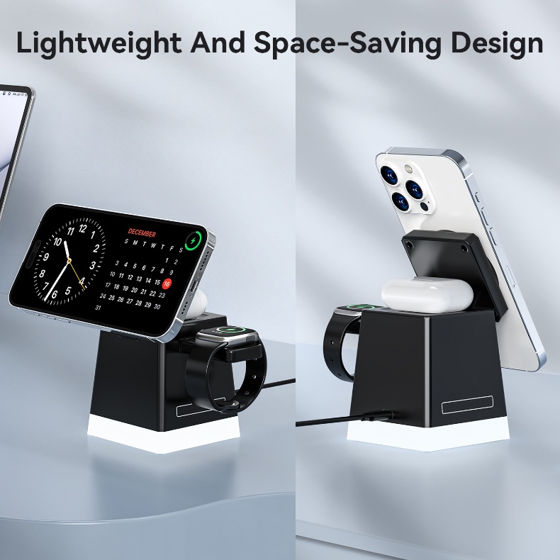 The three-in-one magnetic wireless charger can charge three devices simultaneously: mobile phone, watch and headphones, making your desktop neater and more convenient