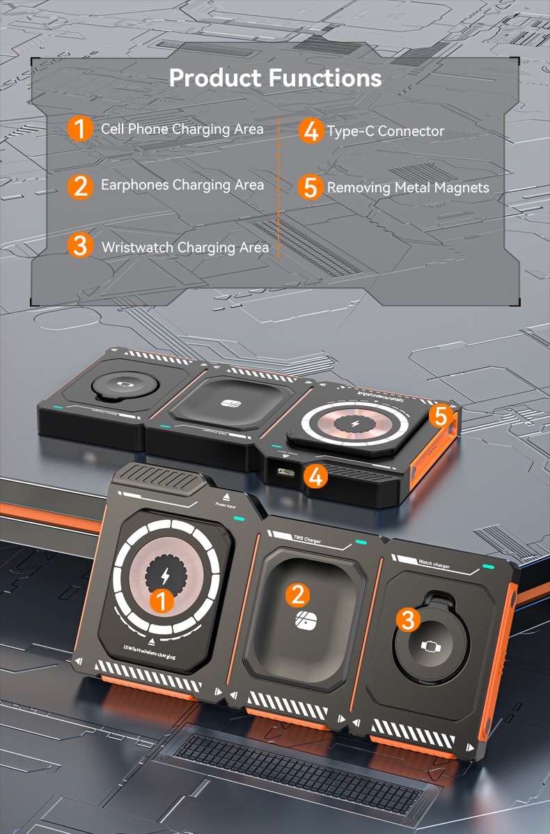 Foldable or Stand-Type Chargers – These compact, travel-friendly chargers combine several charging surfaces into one foldable design or multi-angle desktop stand. They’re especially popular for users who want a single charging station for both home and travel.